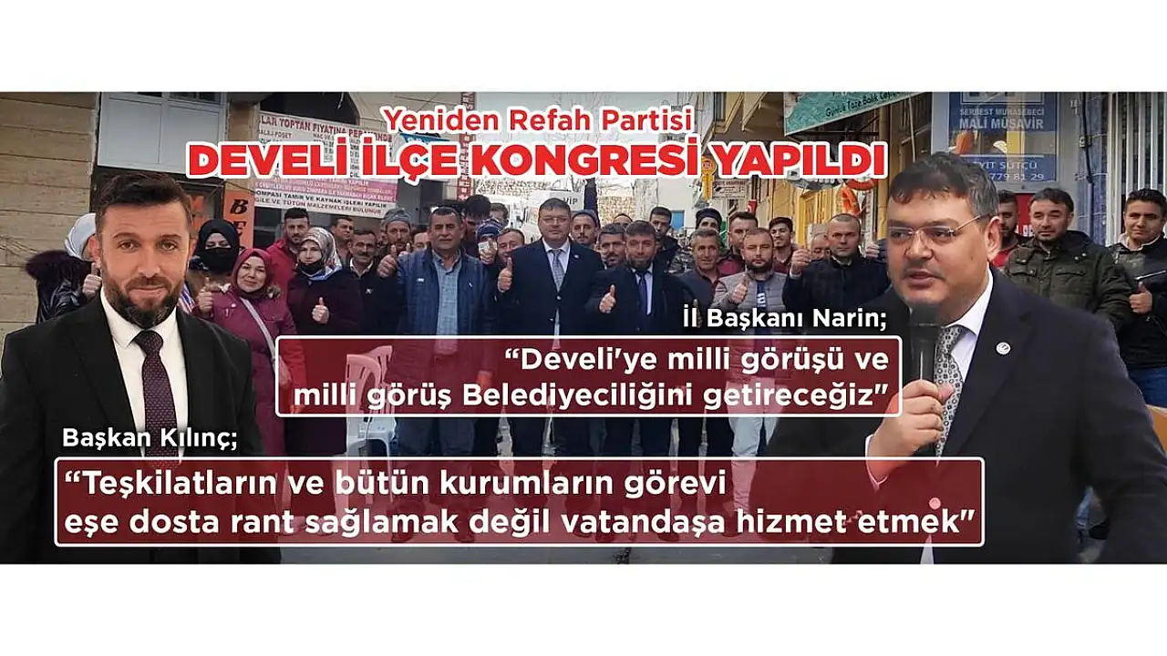 YENİDEN REFAH PARTİSİ DEVELİ İLÇE KONGRESİ YAPILDI İl Başkanı Narin Develi'ye milli görüşü ve milli görüş Belediyeciliğini getireceğiz' - Başkan Kılınç ' Teşkilatların ve bütün kurumların görevi eşe dosta rant sağlamak değil vatandaşa hizmet etmek' Dele