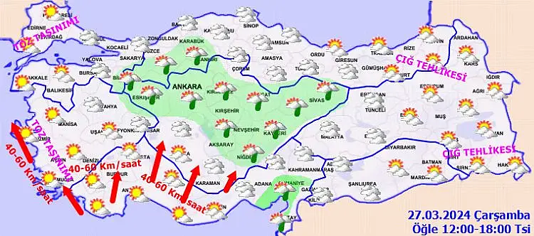 Doğu Karadeniz’in iç kesimleri ile Doğu Anadolu’nun kuzey ve doğusunda çığ tehlikesi beklenirken, bir başka uyarı da Batı Akdeniz'in iç kesimleri ile Güney Ege'de güneyli yönlerden kuvvetli olarak (40-60 km/saat) esmesi beklendiğinden yaşanabilecek olumsuzluklara karşı dikkatli ve tedbirli olunması istendi.