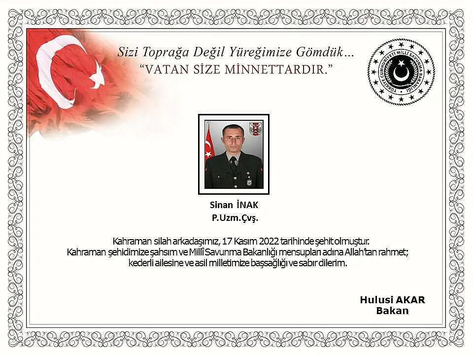 Bakanlık, Pençe-Kilit Operasyonu bölgesinde bugün bölücü terör örgütü mensupları tarafından açılan taciz ateşi sonucu Piyade Uzman Çavuş Sinan İnak'ın şehit olduğunu duyurarak, taziye mesajı yayımladı.