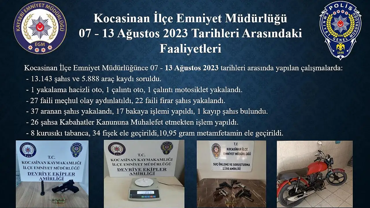 Kocasinan İlçe Emniyet Müdürlüğü 07 - 13 Ağustos 2023 tarihleri arasında gerçekleşen faaliyetleri açıkladı. Bu kapsamda 13 bin 143 kişi ve 5 bin 888 araç kaydı soruldu. Öte yandan 1 yakalama hacizli oto, 1 çalıntı oto, 1 çalıntı motosiklet yakalandı, 27 faili meçhul olay aydınlatıldı, 22 faili firar şahıs yakalandı.