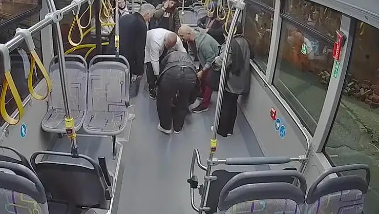 Görüntülerde şoförün hızlı müdahalesi, vatandaşların fenalaşan kişiyi koruyup tuttuğu anlar ve hastanın fedakarca bir seferberlikle sağlık ekiplerine teslim edilmesi yer aldı.