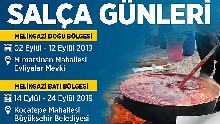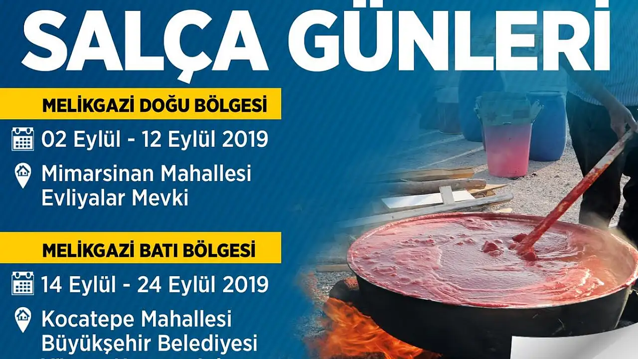 Tüm vatandaşların yararlanabilmesi için iki ayrı bölgede gerçekleştirilecek olan “Melikgazi Salça Günleri” 02-12 Eylül tarihlerinde Mimarsinan Evliyalar Bölgesi’nde ve 14-24 Eylül tarihlerinde ise Belsin Kocatepe Mahallesi Büyükşehir Belediyesi yüzme havuzu arkasında yapılacak.