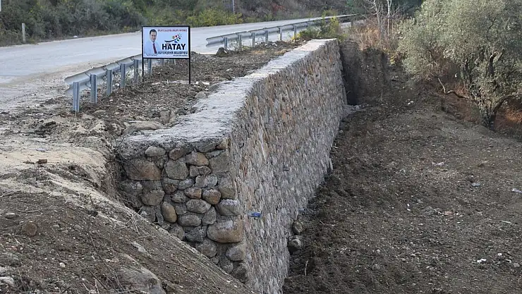 Hatay Büyükşehir Belediyesi Fen İşleri Daire Başkanlığı ekipleri, tehlike arz eden bölgelerde taş duvar çalışmaları gerçekleştiriyor.