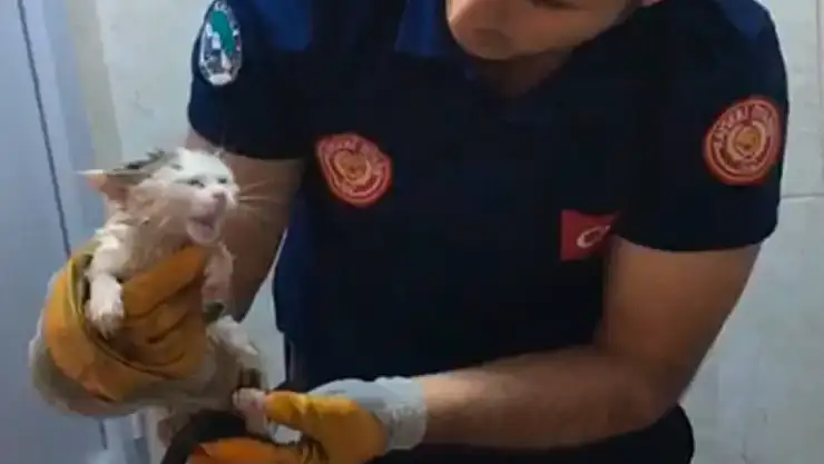 Kayseri Büyükşehir Belediyesi İtfaiye Daire Başkanlığı ekipleri, tuvalet gider borusuna sıkışan yavru kediyi titiz çalışma sonucunda sağlıklı bir şekilde kurtardı.